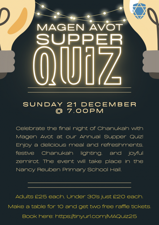 Celebrate the final night of Chanukah with Magen Avot at our Annual Supper Quiz! Enjoy a delicious meal and refreshments, festive Chanukah lighting, and joyful zemirot. The event will take place in the Nancy Reuben Primary School Hall.